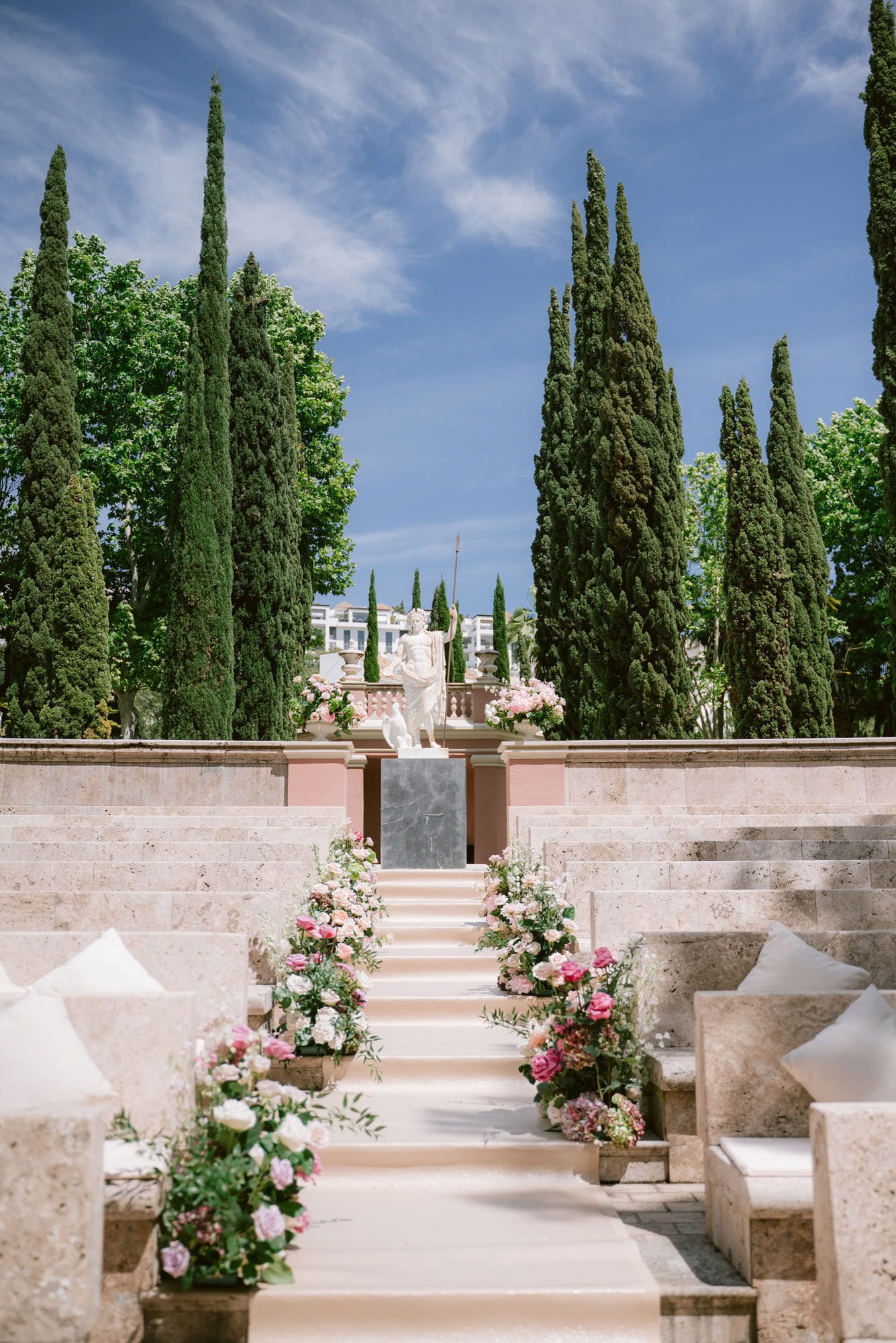 From ceremonies in the Roman amphitheatre to receptions set across terraces and gardens, the space allows each part of the day to unfold in a distinctly elevated Mediterranean backdrop.
